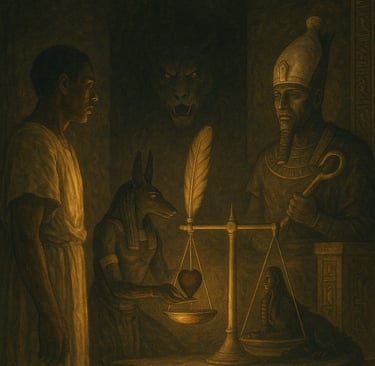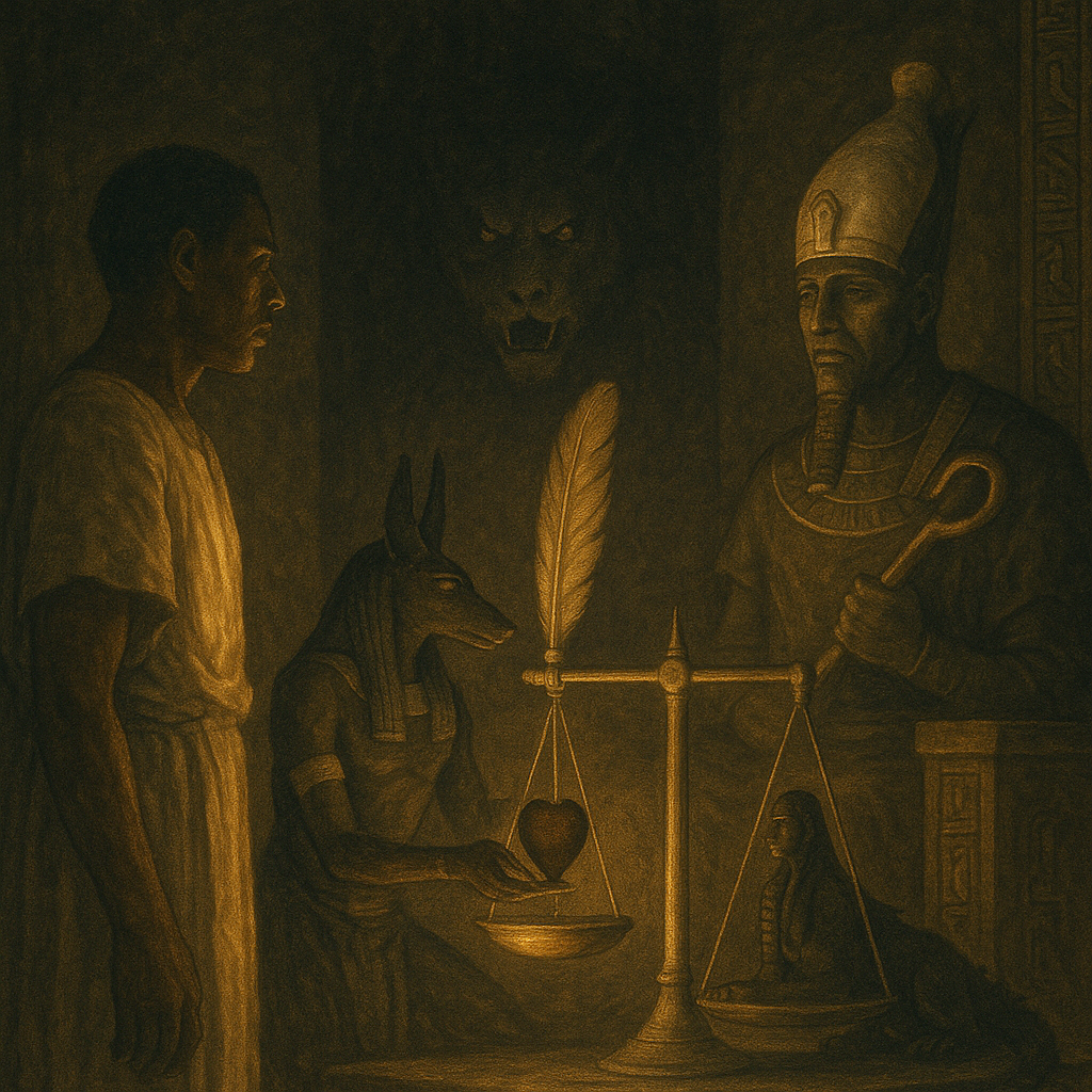 Ces textes sont des "guides de voyage" pour un aller simple. Ils décrivent le voyage périlleux et unique de l'âme à travers le monde souterrain (la Douat). Le point culminant de ce voyage est la cérémonie de la Pesée du Cœur. Devant le tribunal d'Osiris, le cœur du défunt est pesé contre la plume de Maât (la vérité). Le verdict est binaire et sans appel :